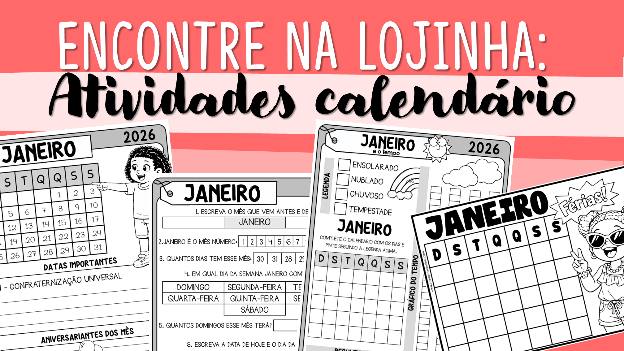 Além do calendário de parede, gosto de sempre trabalhar o calendário de cada mês. Fiz um material muito legal onde você pode explorar o calendário de cada mês. Esse arquivo está na lojinha e contém: calendários para completar com as datas, calendário datado para registro das datas importantes, atividades sobre cada mês e folhas de registros do tempo de cada um (ensolarado, chuvoso..).