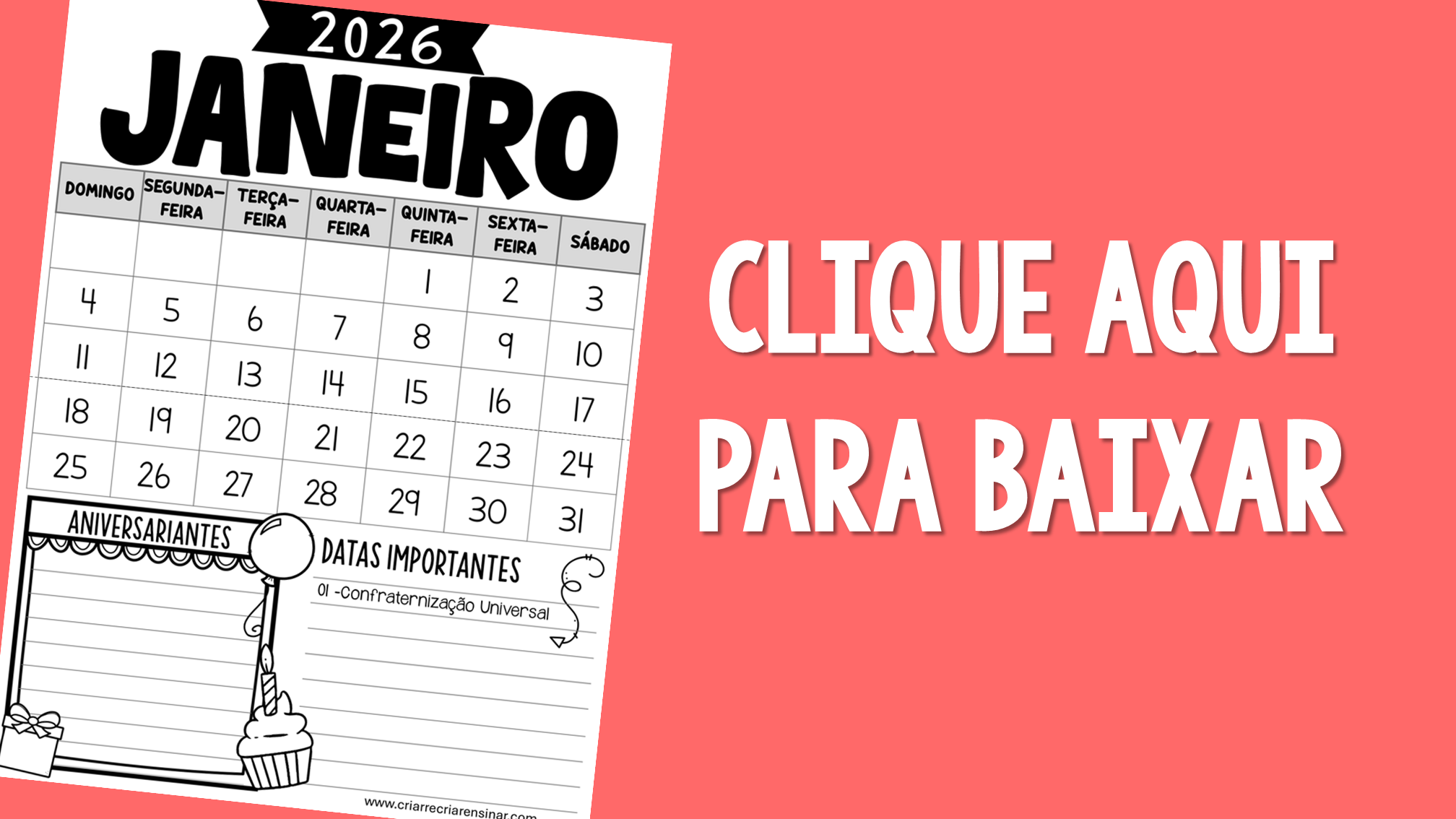 Fiz a versão colorida e a versão preto/branco. Nesse calendário, tem espaço para as datas importantes e para os aniversariantes de cada mês para completar com os alunos.