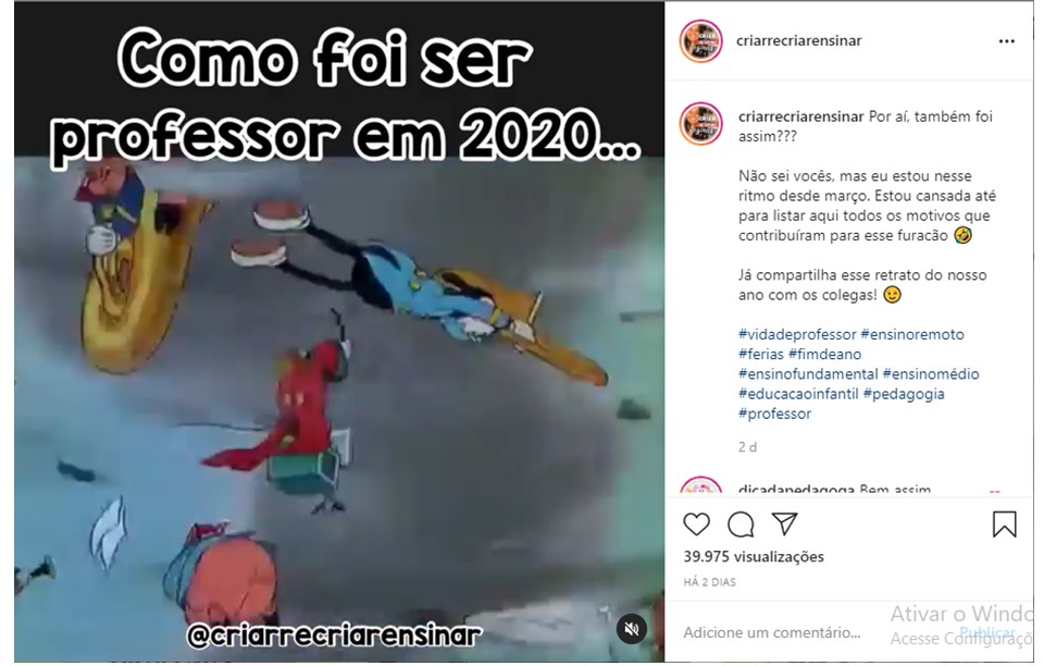Essa semana postei na minha página no Instagram esse vídeo, “ilustrando” como foi o ano dos professores. Nesse link https://www.instagram.com/p/CIjHkxuFn-w/?utm_source=ig_web_copy_link você pode ver o vídeo.