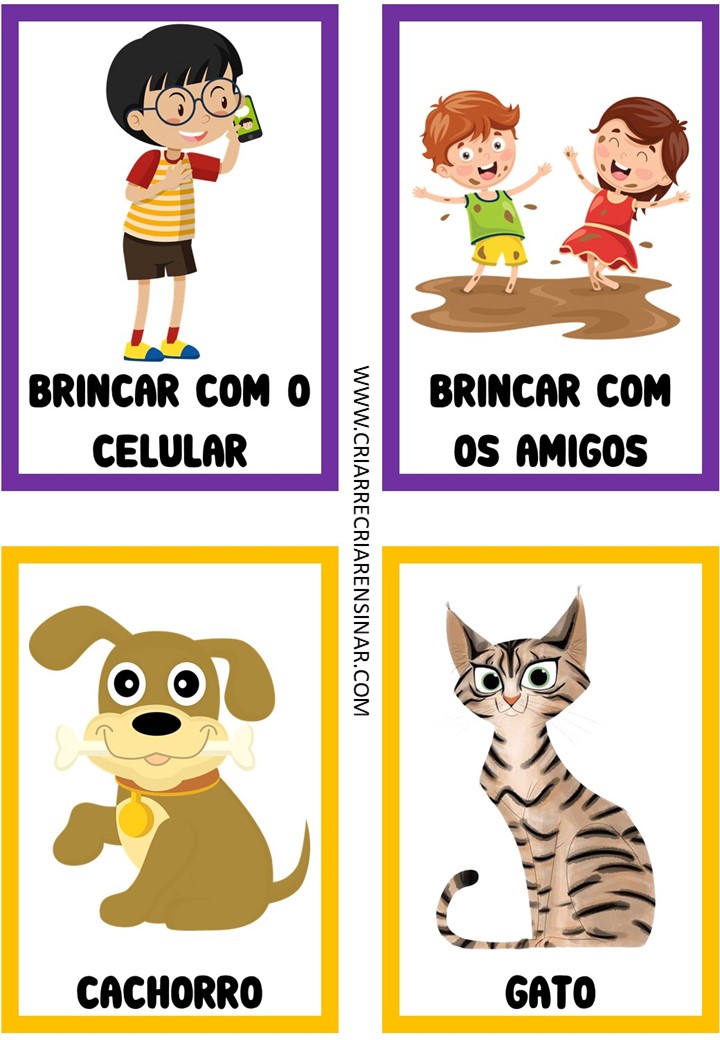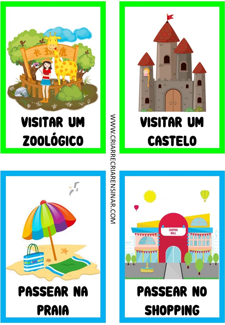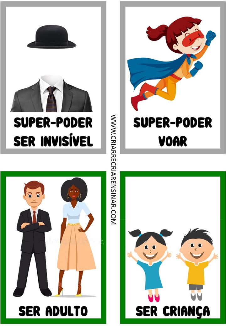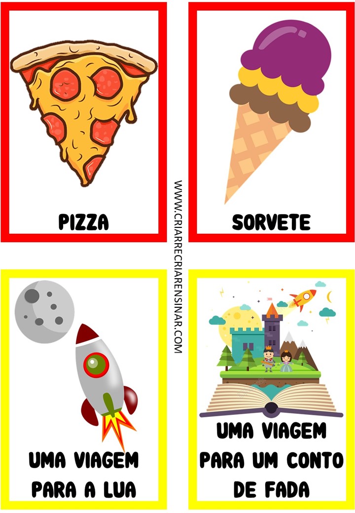 NESSA DINÂMICA SERÃO APRESENTADAS DUAS OPÇÕES, A CRIANÇA DEVE ESCOLHER QUAL ELA PREFERE E EXPLICAR O MOTIVO. AS CARTAS ESTÃO SEPARADAS POR CORES.