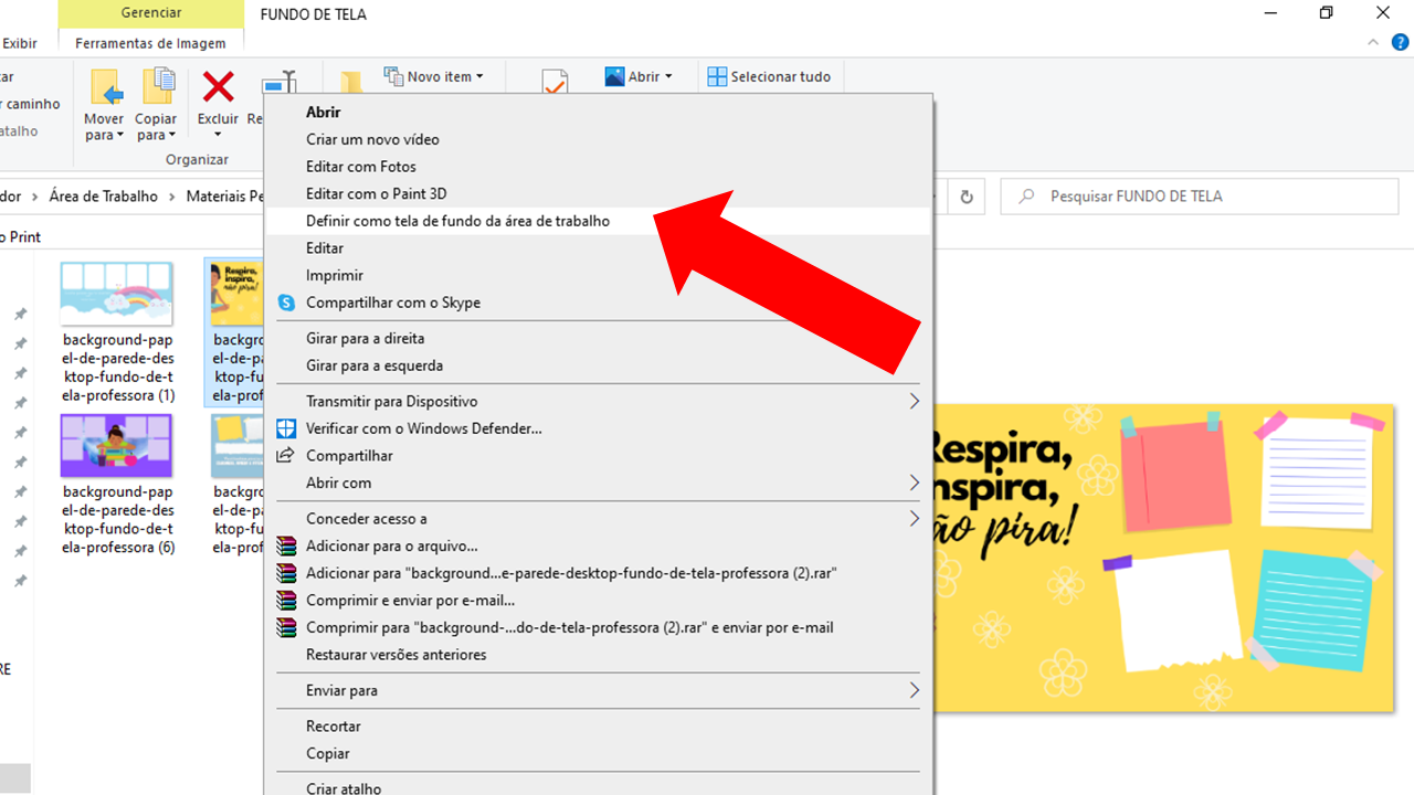 3. Clique com o botão direito do mouse no arquivo e selecione “Definir como tela de fundo da área de trabalho”, como mostra a imagem abaixo.