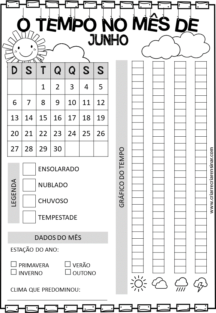 NESSA ATIVIDADE AS CRIANÇAS PODERÃO REGISTRAR DIARIAMENTE O TEMPO. ALÉM DISSO, COM OS DADOS REGISTRADOS, NO FIM DO MÊS ELAS COMPLETARÃO O GRÁFICO E APONTARÃO O CLIMA PREDOMINANTE NAQUELE MÊS.