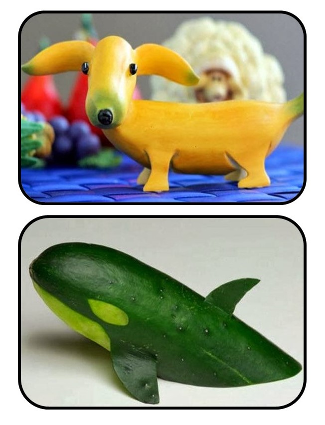 Animais construídos com frutas e legumes.