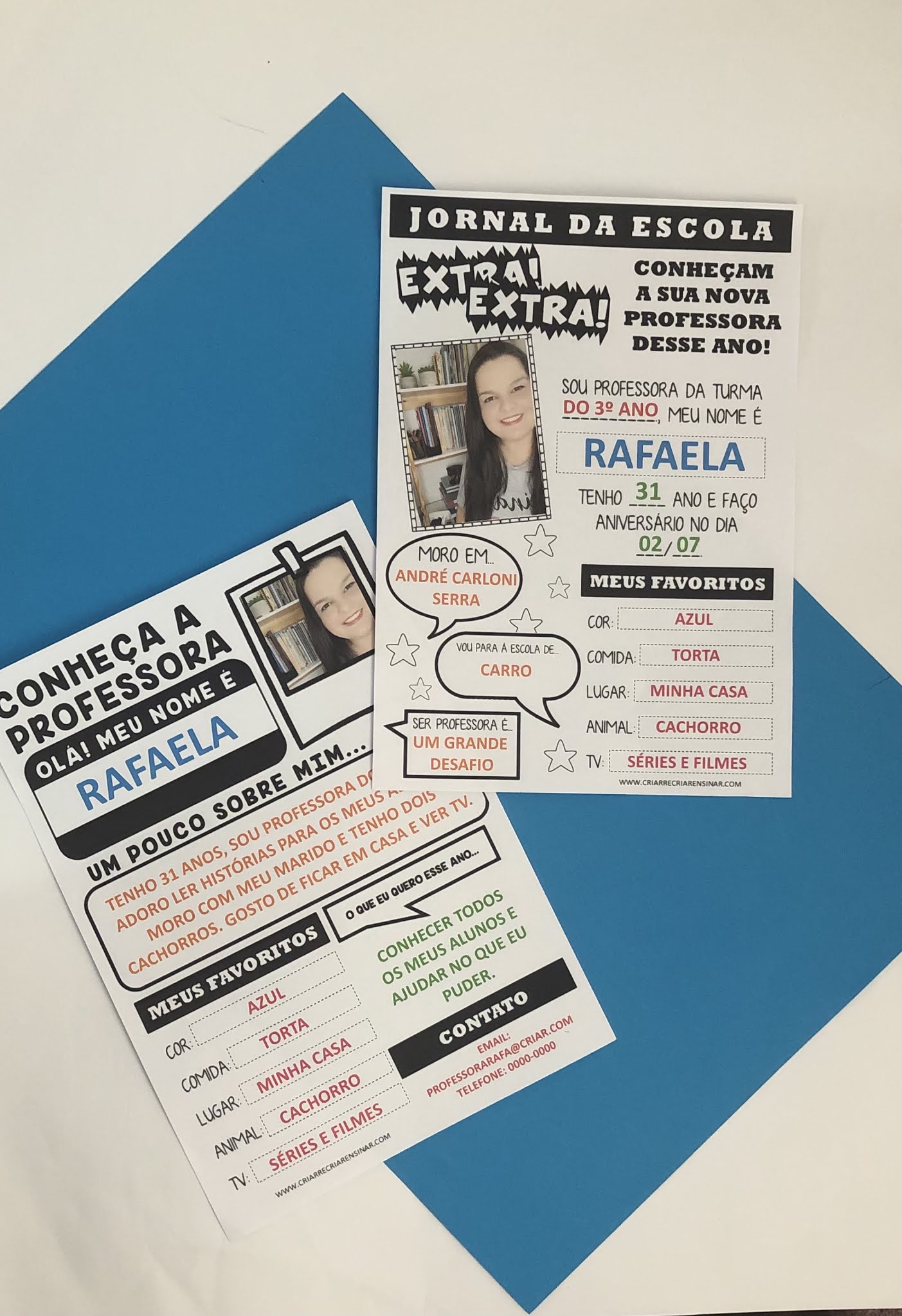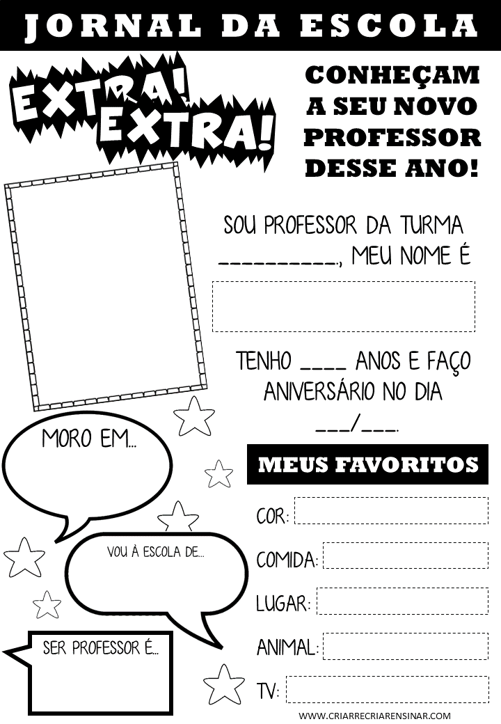 NESSE MATERIAL, A PROFESSORA PREENCHE COM SUAS INFORMAÇÕES E FOTO COMO SE FOSSE UM JORNALIZINHO..